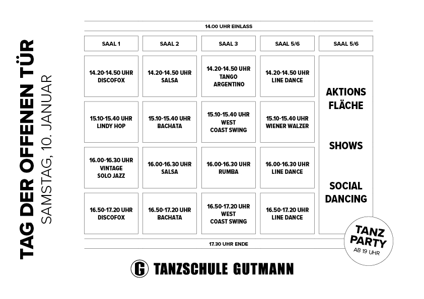 • Schnupperkurse in verschiedenen Tanzstilen – u. a. Discofox, Salsa, Tango Argentino, Bachata, West Coast Swing, Lindy Hop, Wiener Walzer, Rumba, Line Dance, Solo Jazz